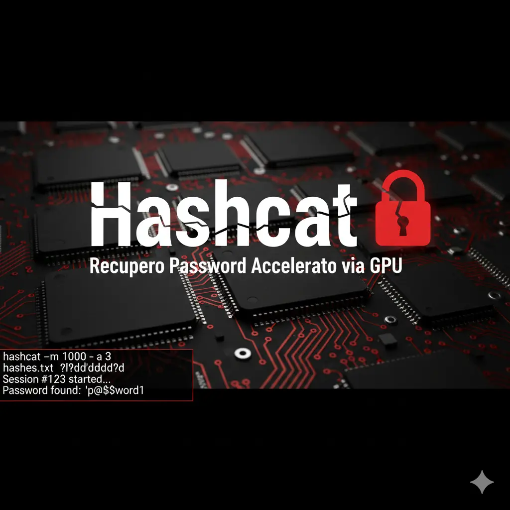 Hashcat: guida pratica GPU password cracking per hash NTLM, MD5, SHA, bcrypt. Attack modes, mask patterns, wordlist rules e tecniche reali da CTF e penetration testing.