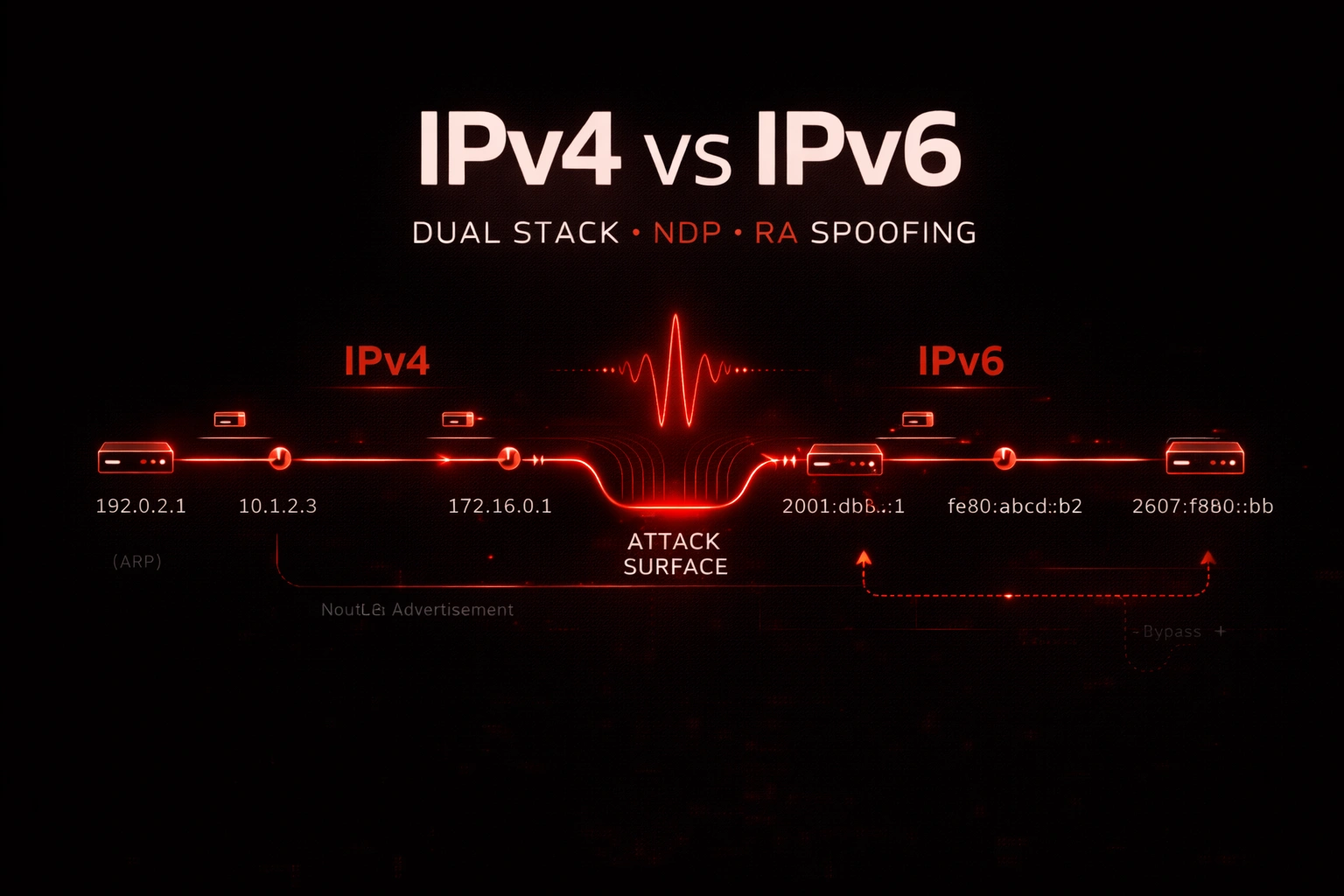 Scopri le differenze tra IPv4 e IPv6 e perché contano nel pentesting: SLAAC, NDP, RA spoofing, scanning IPv6, dual-stack, bypass dei controlli e difese.