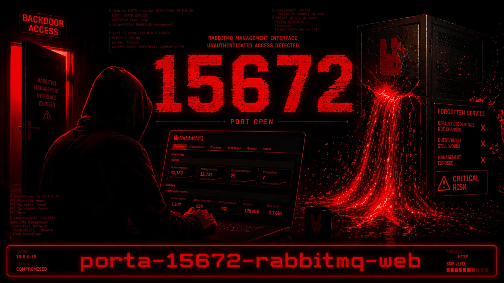 RabbitMQ è il message broker open source più diffuso al mondo: gestisce le code di messaggi tra i servizi di un’applicazione. Quando il sito e-commerce processa un ordine, quel messaggio passa per RabbitMQ. Quando il sistema di notifiche manda un’email, passa per RabbitMQ. Quando il microservizio di pagamento comunica con quello di fatturazione — hai indovinato — passa per RabbitMQ. La porta 15672 TCP è l’interfaccia web di Management che permette di monitorare e gestire tutto: code, messaggi, utenti, permessi. E con credenziali di default (guest:guest), permette anche di leggere ogni singolo messaggio in transito, creare utenti admin e, tramite il cookie Erlang, ottenere RCE sul server.
