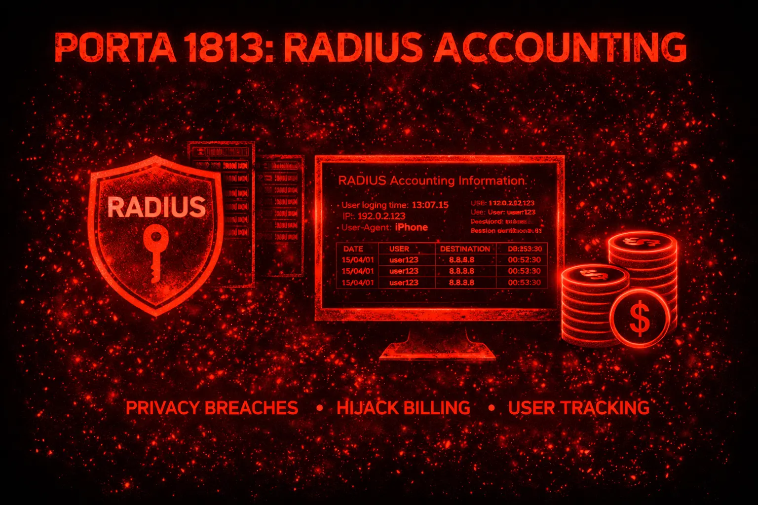 Executive Summary — La porta 1813/UDP ospita il servizio di accounting RADIUS, il componente che registra l’inizio/fine delle sessioni, il traffico consumato, gli IP assegnati e la durata di connessione. Mentre la porta 1812 gestisce l’autenticazione (chi può connettersi), la 1813 traccia le sessioni (chi è connesso, da quando, con quale IP). Per il pentester, l’accounting RADIUS è una fonte di intelligence: rivela quali utenti sono connessi, i loro IP interni e i tempi di connessione. Lo shared secret è lo stesso della porta 1812 — compromettere uno compromette entrambi.