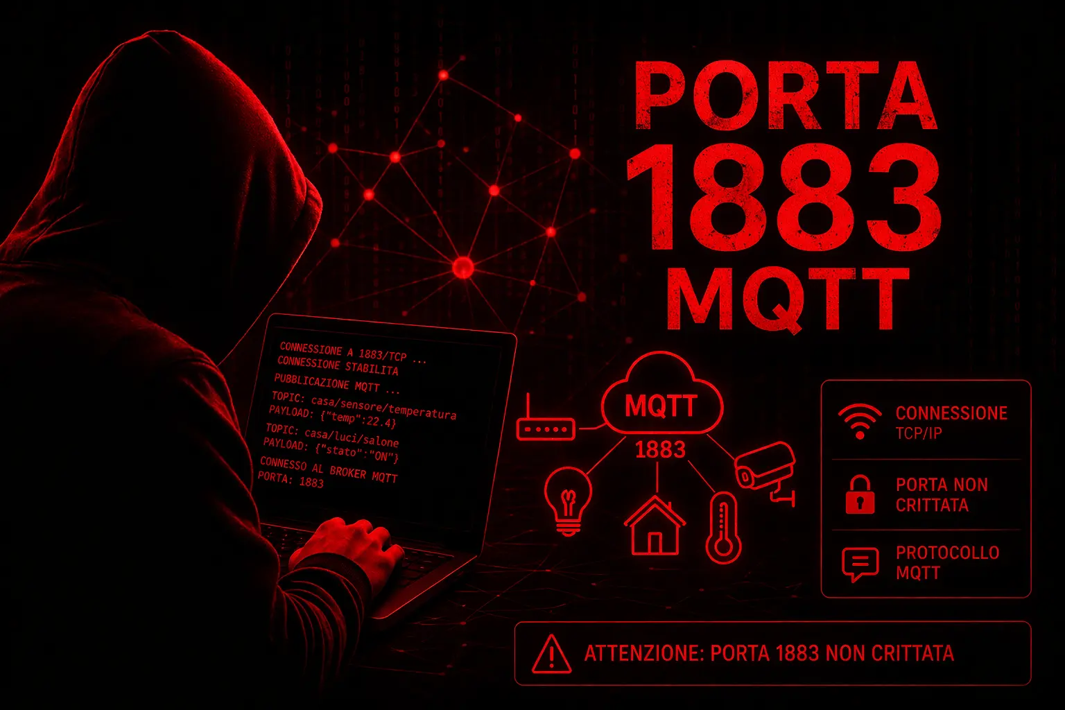 La porta 1883 è la porta TCP utilizzata dal protocollo MQTT in chiaro (senza cifratura). MQTT è un protocollo leggero publish/subscribe usato nei sistemi IoT per comunicare tra dispositivi e broker. Se il broker è mal configurato, un attaccante può leggere i dati scambiati, intercettare credenziali e inviare comandi ai dispositivi connessi. Nel pentesting, la 1883 rappresenta un punto critico per information disclosure, command injection e controllo remoto dei dispositivi.