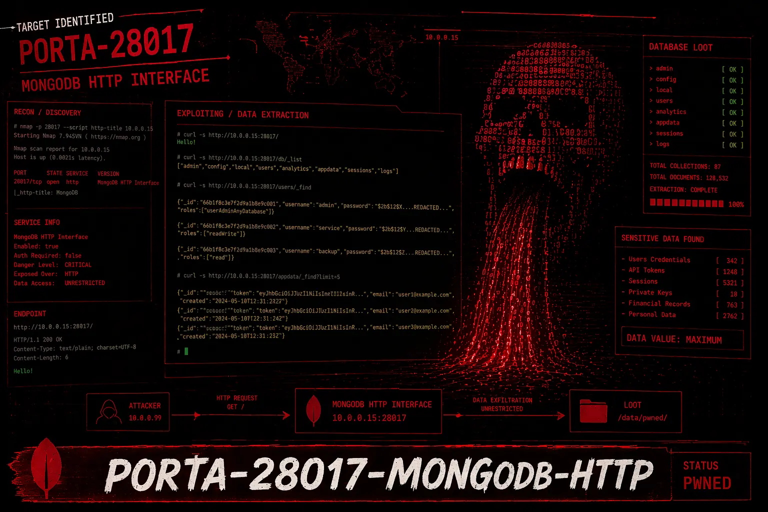 Porta 28017 aperta? Leggi versione, hostname e log senza credenziali, dumpa dati via REST API e pivota sulla 27017. Solo su MongoDB legacy ≤ 3.4, spesso non patchato.