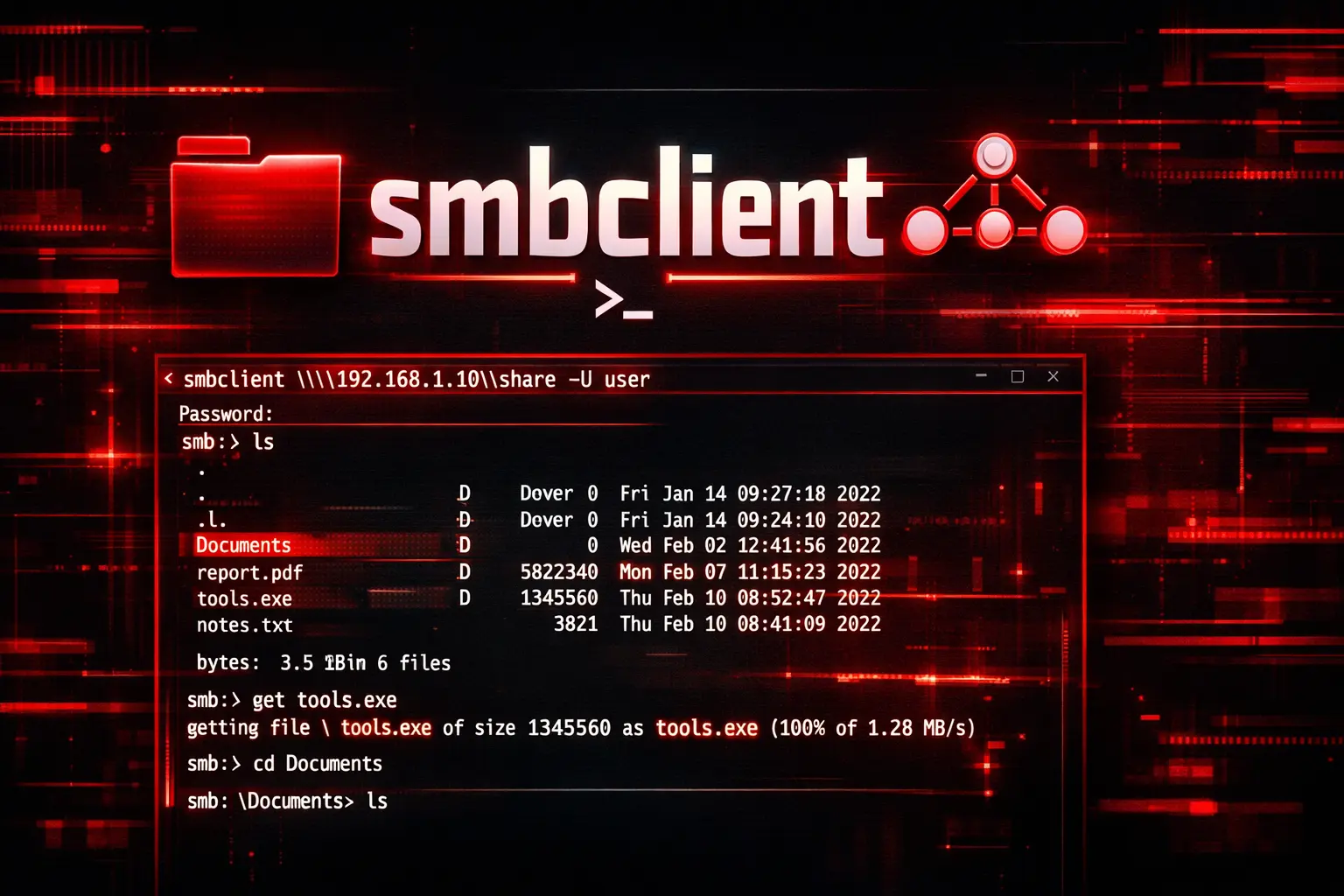smbclient //192.168.1.100/Users -U johnUna volta connesso, ricevi un prompt smb: \> dove puoi eseguire comandi interattivi.
