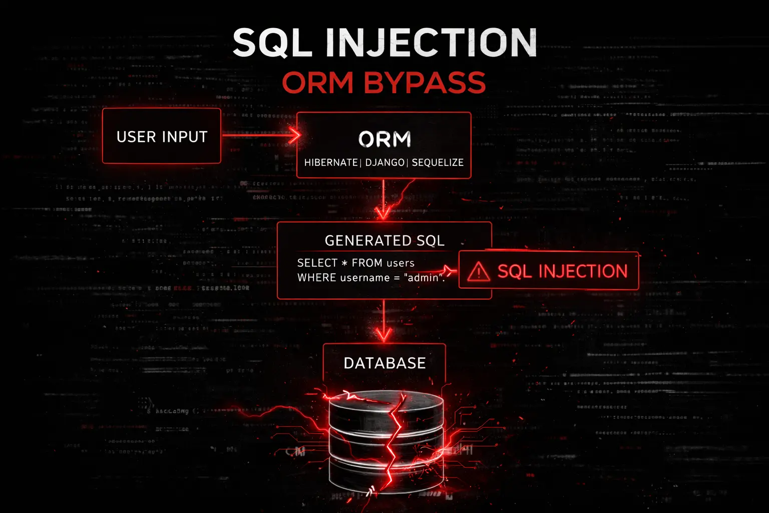 SQL Injection su ORM: vulnerabilità in Django, Laravel, Hibernate e Sequelize. Raw query, extra(), orderByRaw e exploitation reale con esempi pratici.
